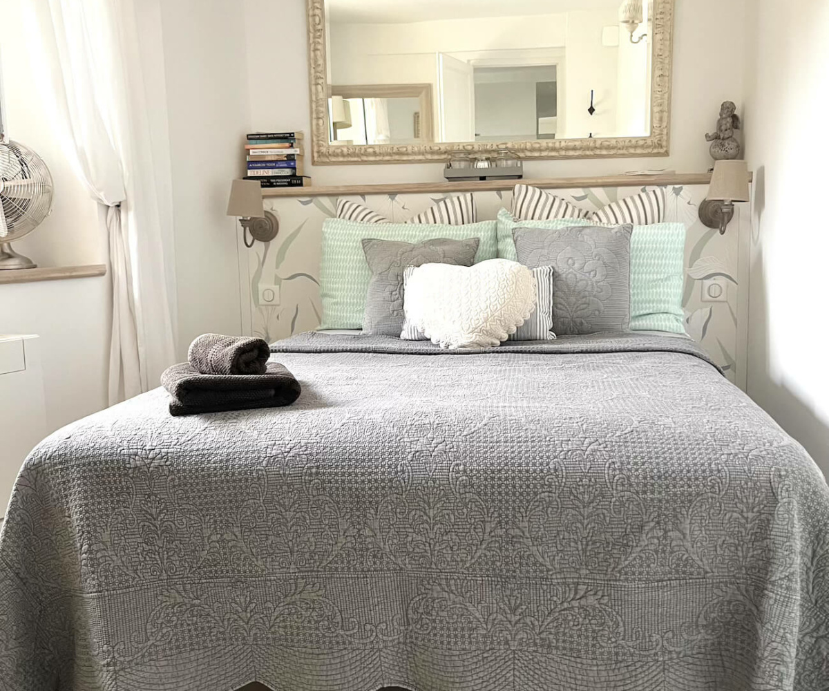 The main bedroom has a double window, double bed (140cm), mirror and storage. After that, there is a pretty view to the hills beyond. At last, air con is provided, which is sufficient to cool the entire apartment if you leave the door open plus there are fans at your disposal during the summer months.