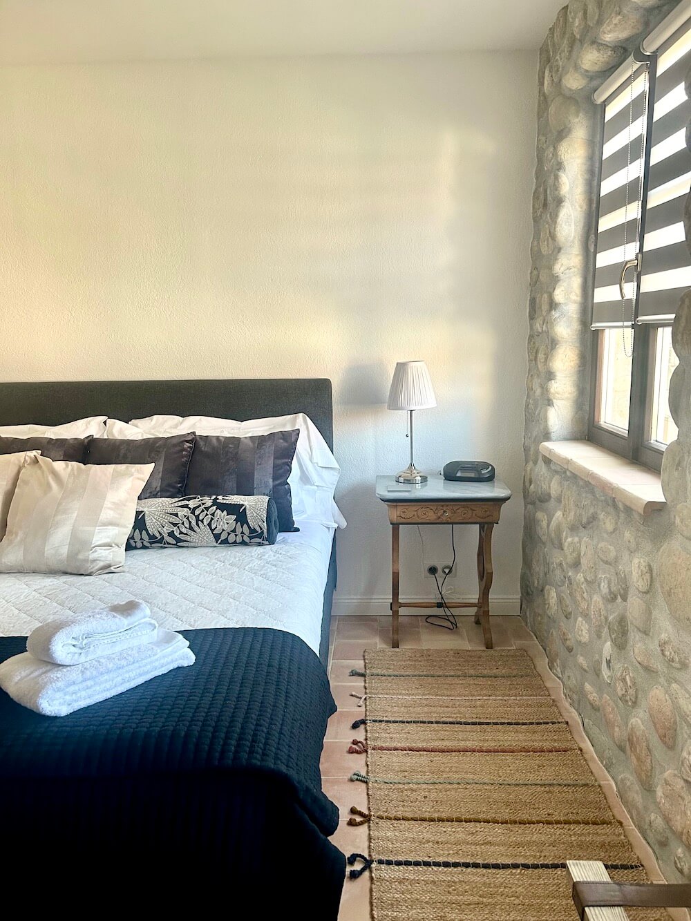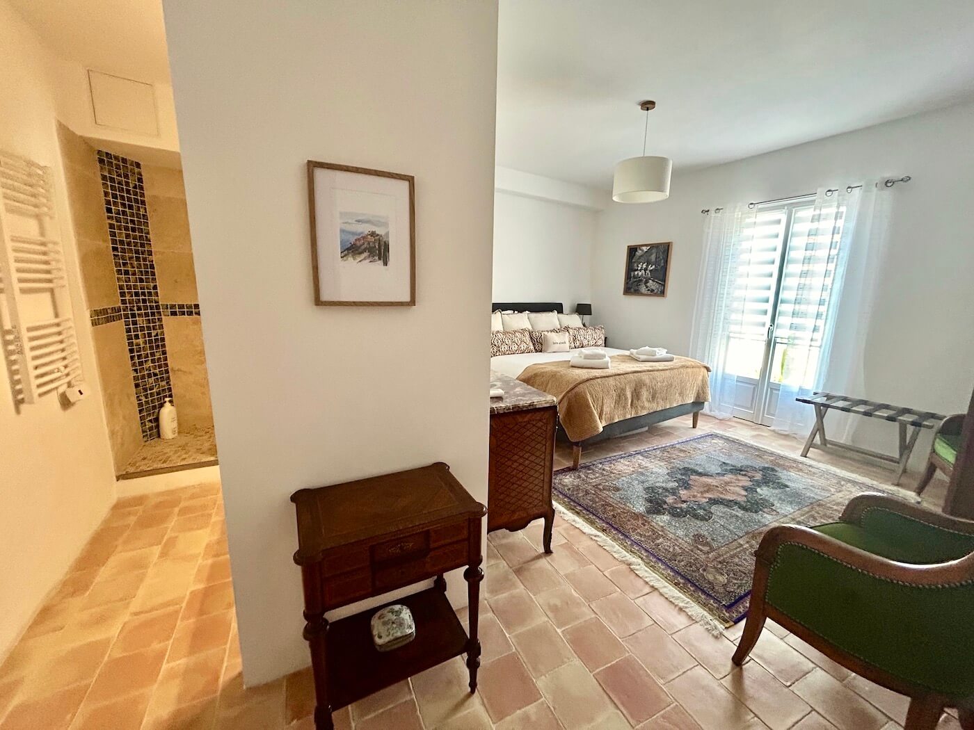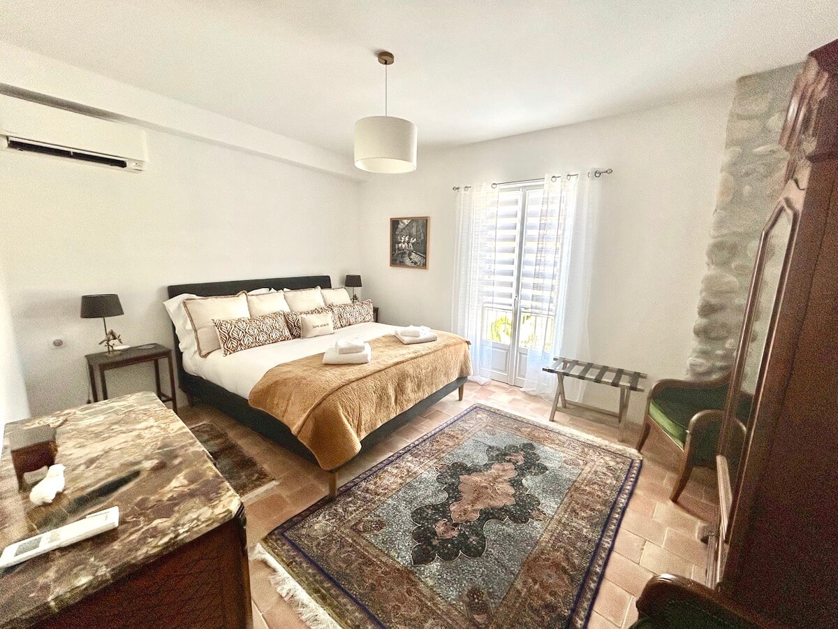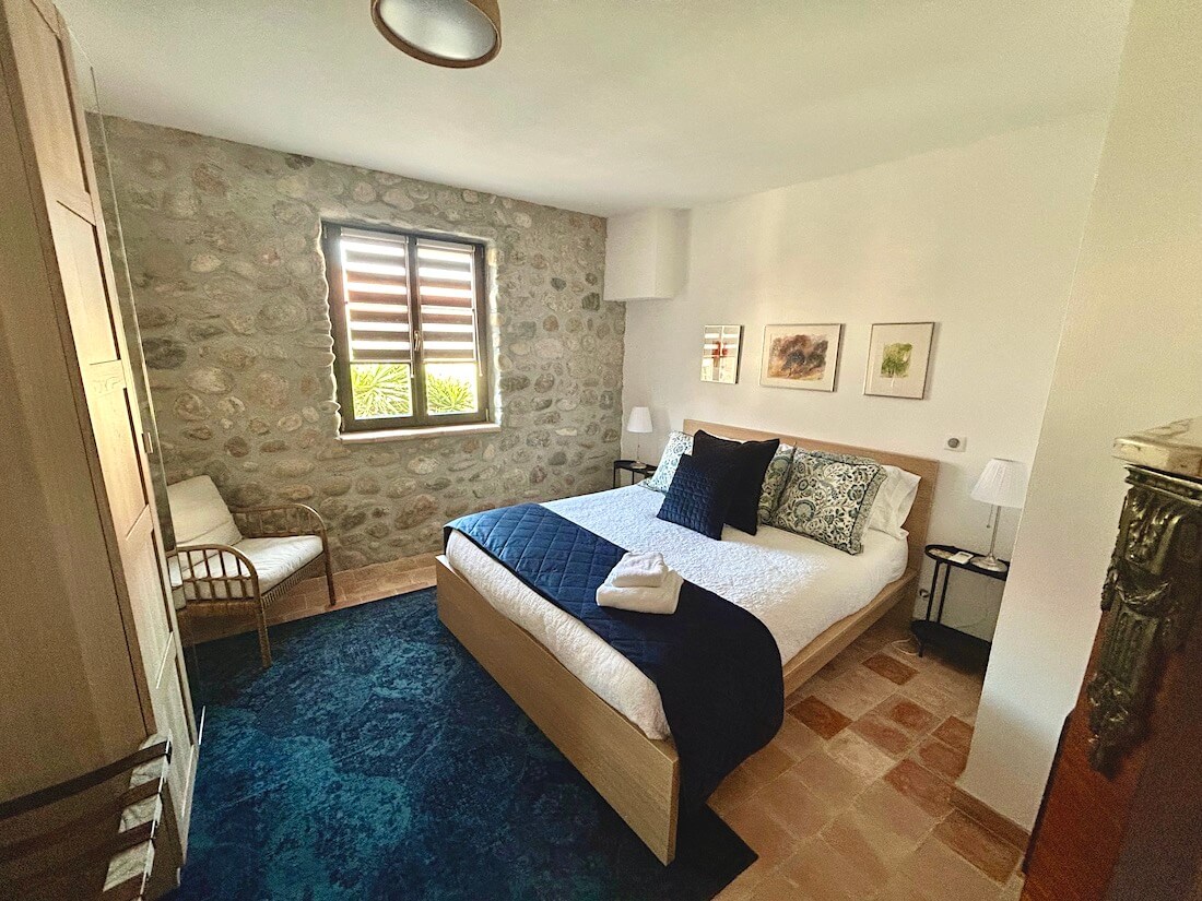 The last bedroom is the main bedroom with French doors that open over the garden. The bed is 190cm, there is a stone wall detail and ensuite bathroom with walk-in shower, w.c and wash hand basin is in beige and white.
