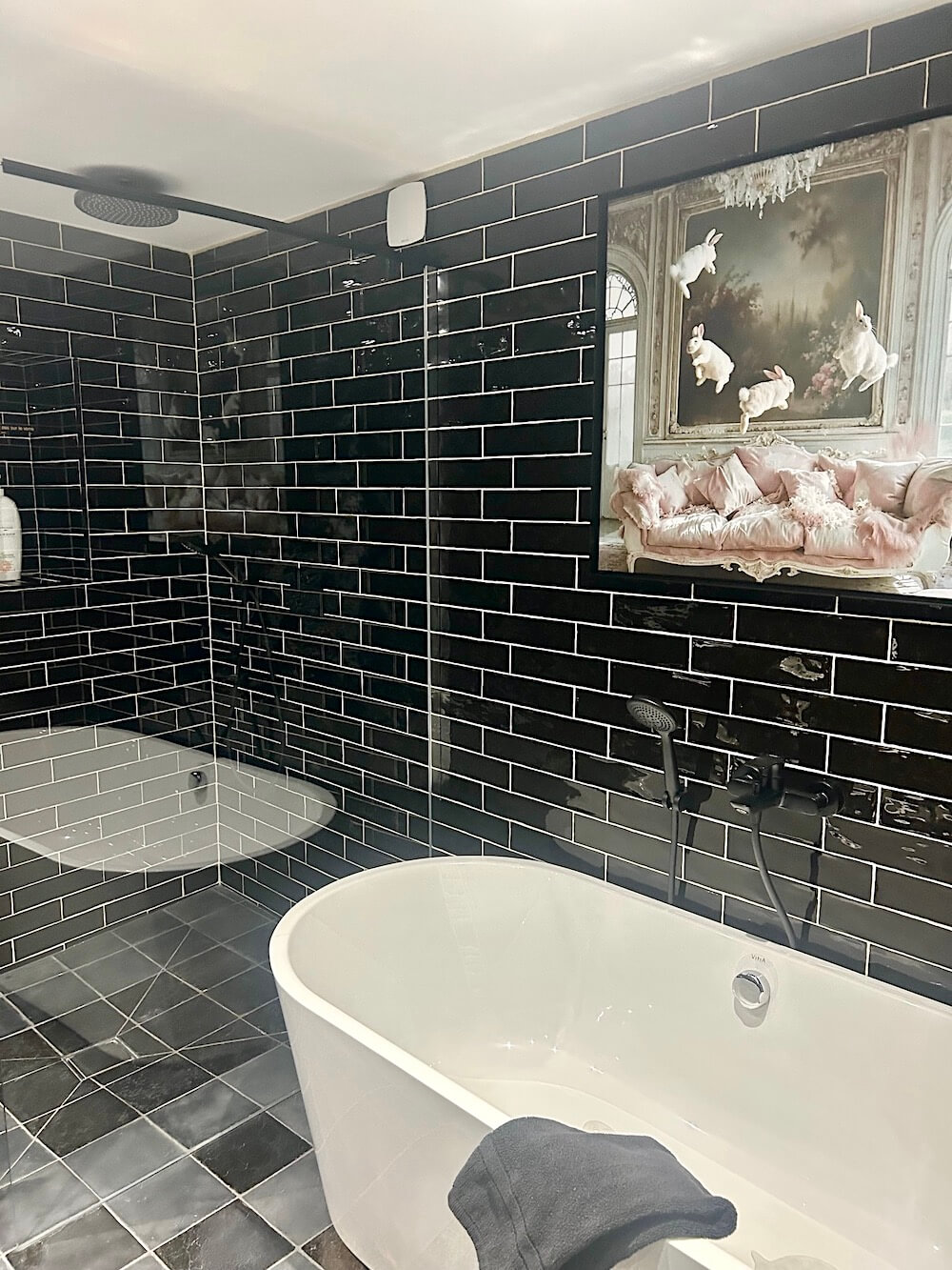 The second bedroom in white and beige also has a stone far wall but with 2 windows, the bathroom is opposite on the other side of the corridor. The bed is 180cm. The bathroom is large with walk-in shower and standing bathtub. There is a w.c and wash hand basin – all in a stunning black, grey and white.