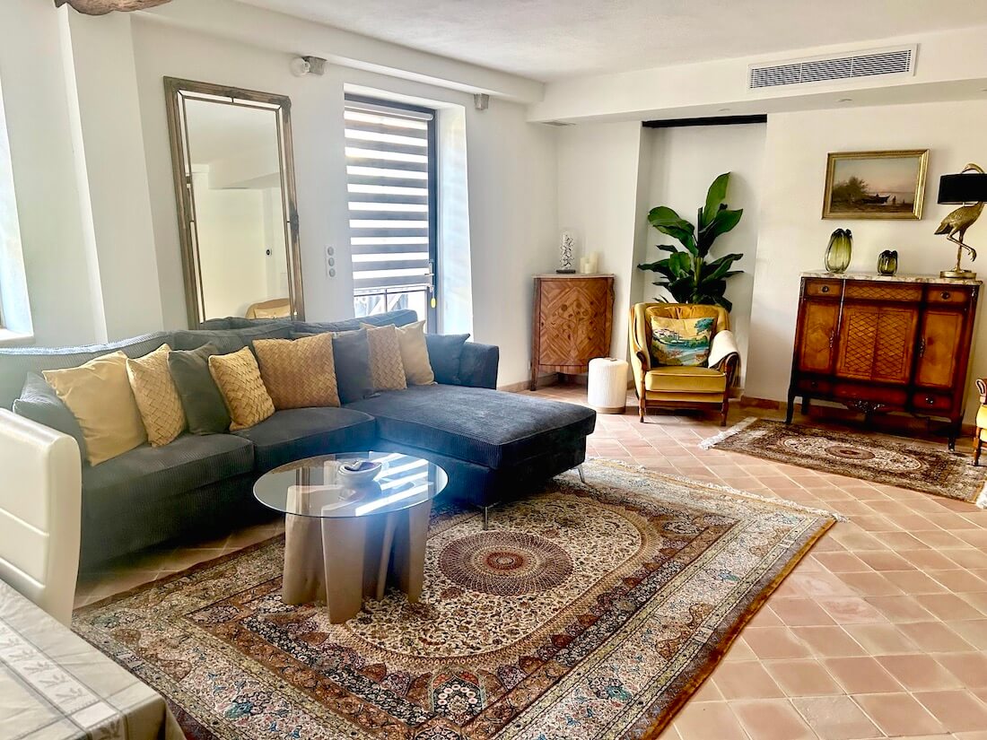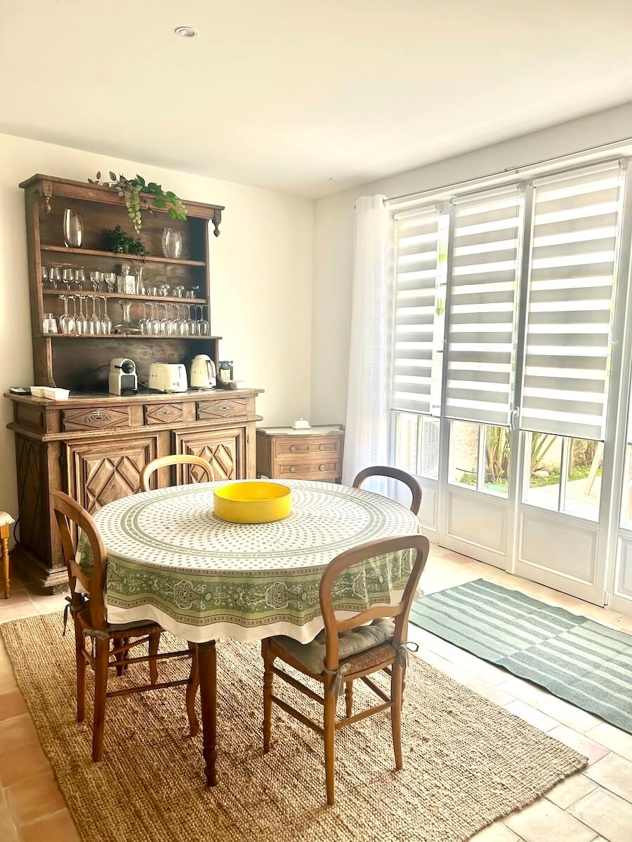Enter directly into the sitting room area with L shaped sofa and armchairs, a coffee table, poufs plus a huge television screen. From here there is access into the garden. Behind the sitting area is a large, contemporary, wooden dining table with 6 chairs. The kitchen is also contemporary in style in grey and beige. There is a butcher’s table adding additional space and storage plus a round, kitchen table and dresser. French doors provide another access to the garden. The oven is electric with an induction cooktop with 4 heating points. Additionally there is a microwave, fridge/freezer, Nespresso machine, French press coffee pot, teapot and dishwasher.